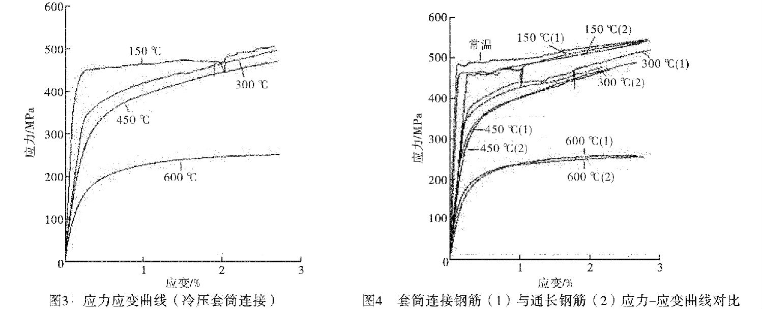 通過研究鋼筋連接套筒在高溫下的力學性能,并且與通長鋼筋作對比,由試驗結果可以看出,套筒連接形式對鋼筋在高溫下的抗火性能影響不大,在鋼筋連接套筒拉伸至抗拉強度直至塑性變形時,套筒的變形量仍在彈性變形范圍內(nèi),未發(fā)生破壞,其應力-應變曲線與通長鋼筋基本吻合,高溫下鋼筋的屈服強度和彈性模量劣化程度基本相同。在結構的耐火分析中,建議對有套筒連接形式的鋼筋在高溫下的屈服強度和彈性模量按照文中擬合的公式(3)、式(4)計算,從而使對結構的抗火性能評估更加合理可靠。