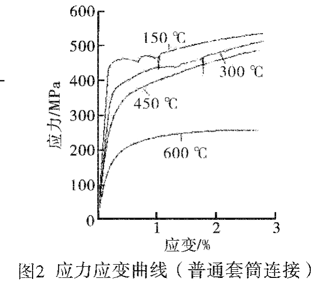 通過處理實驗數(shù)據(jù),得到了高溫下采用不同套筒連接的鋼筋的應力-應變曲線,如圖2、圖3所示。并且與通長鋼筋在高溫及常溫下的應力-應變曲線作對比(圖4),可以看出采用套筒連接的鋼筋與無連接形式的鋼筋的應力-應變曲線幾乎是吻合的,可以認為鋼筋在高溫下采用套筒連接對其應力-應變曲線影響較小。